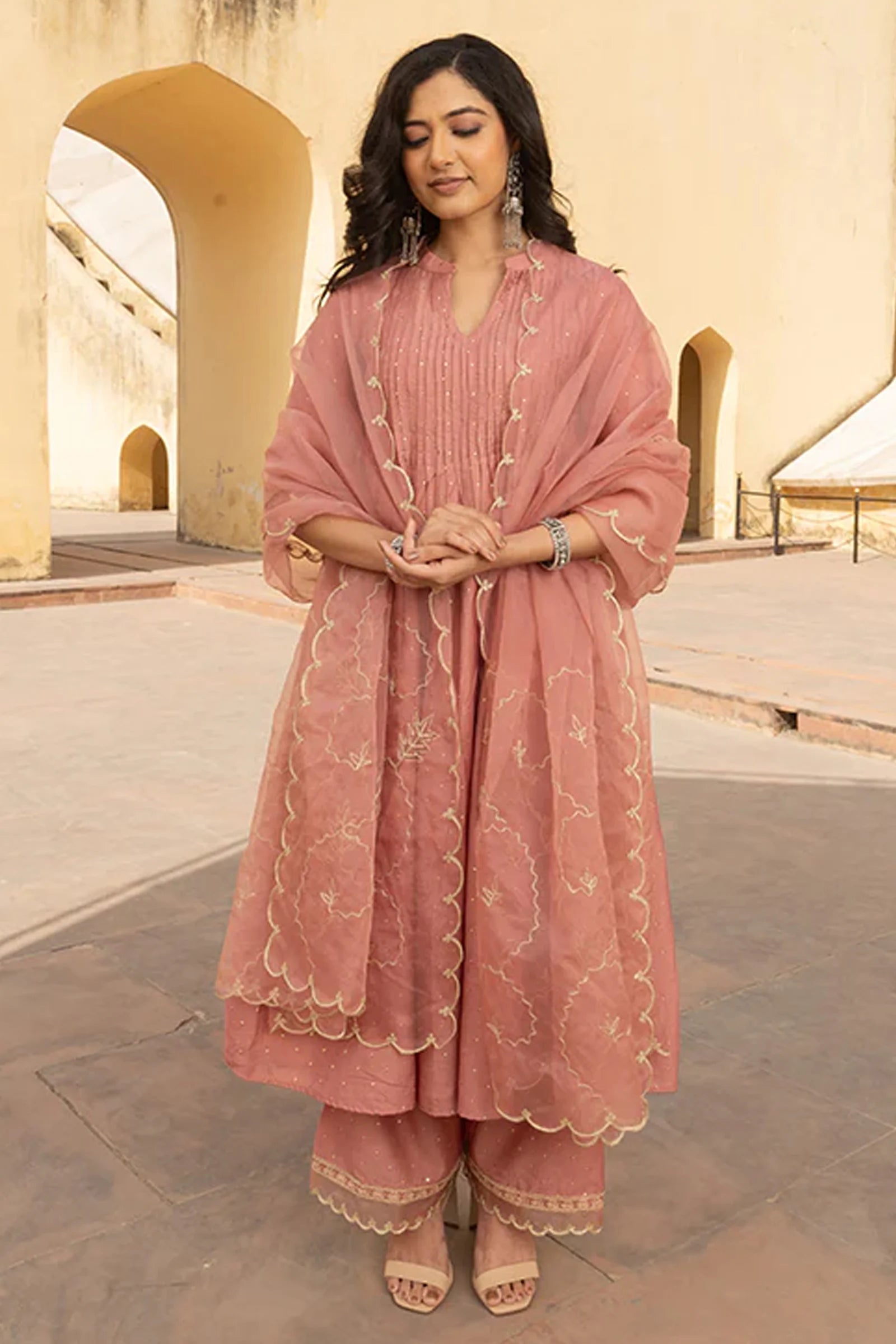 1. Old Rose Chanderi Mukaish Work Pintuck Kurta Set