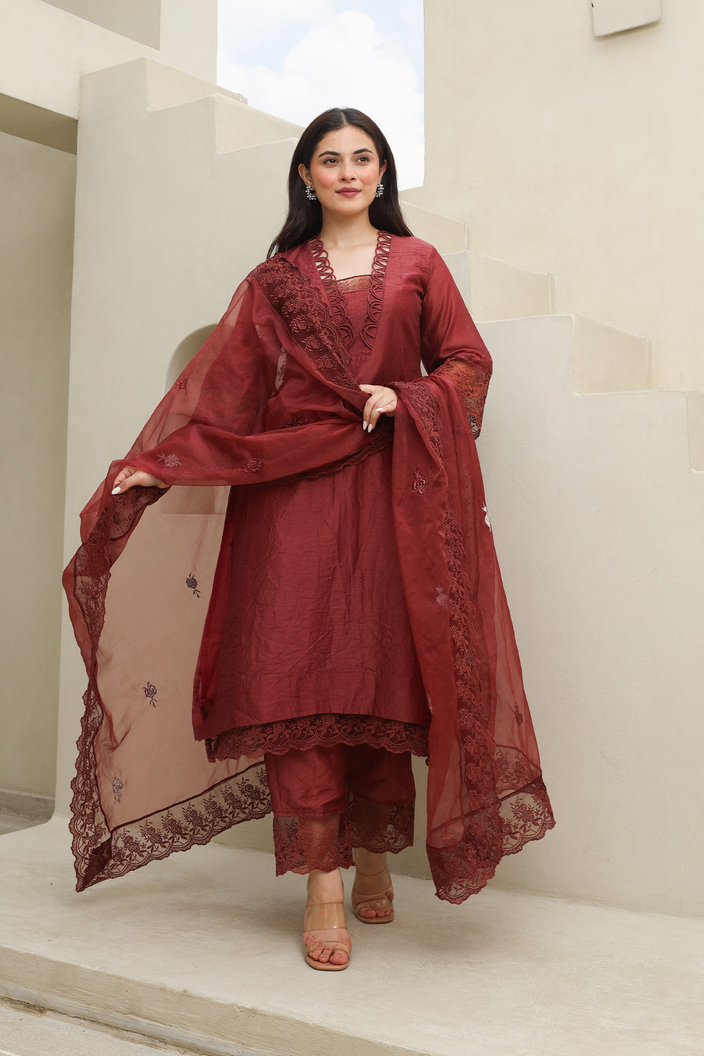 Chanderi fabric forms a heavy texture but is extremely light with a soft sheen. Sometimes, it was chosen and even used for wedding attire. A kurta set is a classic form of chanderi, suitable for an event at daytime or night functions. Asrumo's chanderi kurta set comes with delicate patterns and intricate designs which bring the elegance of this traditional fabric to the wedding wardrobe. The wedding Kurta Set is perfect for any function.